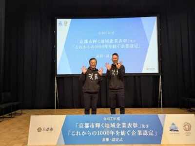 1月14日に京都市様が認定している「1000年を紡ぐ企業」に認定いただきました。