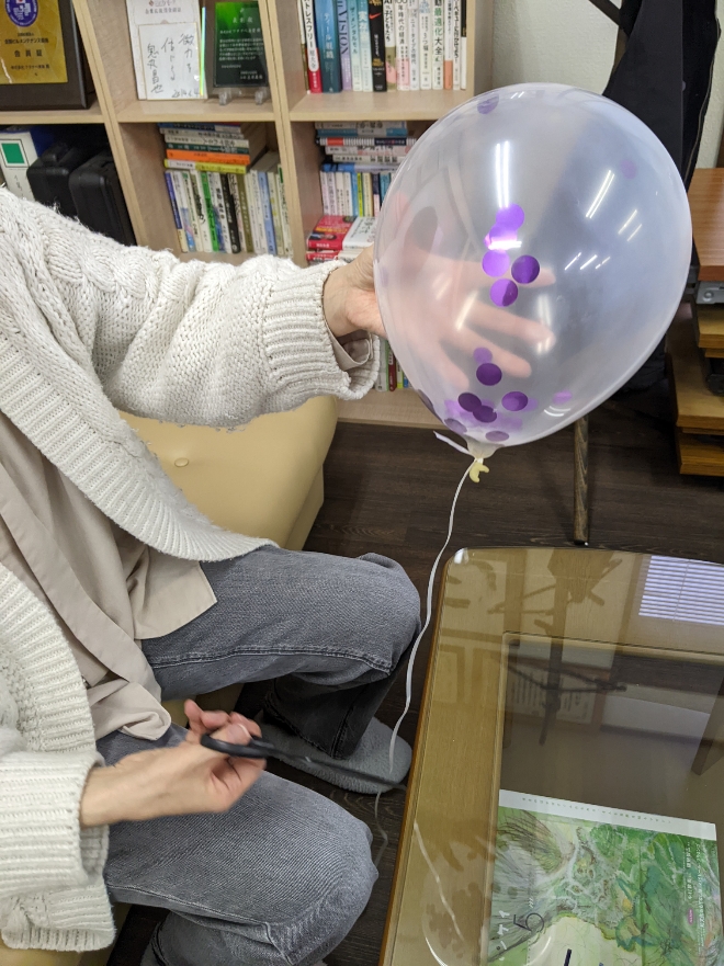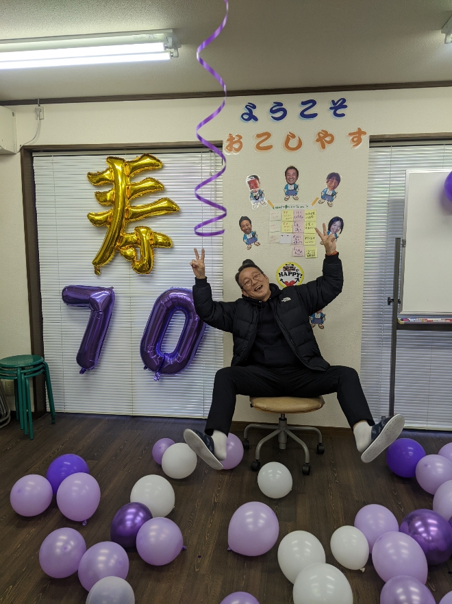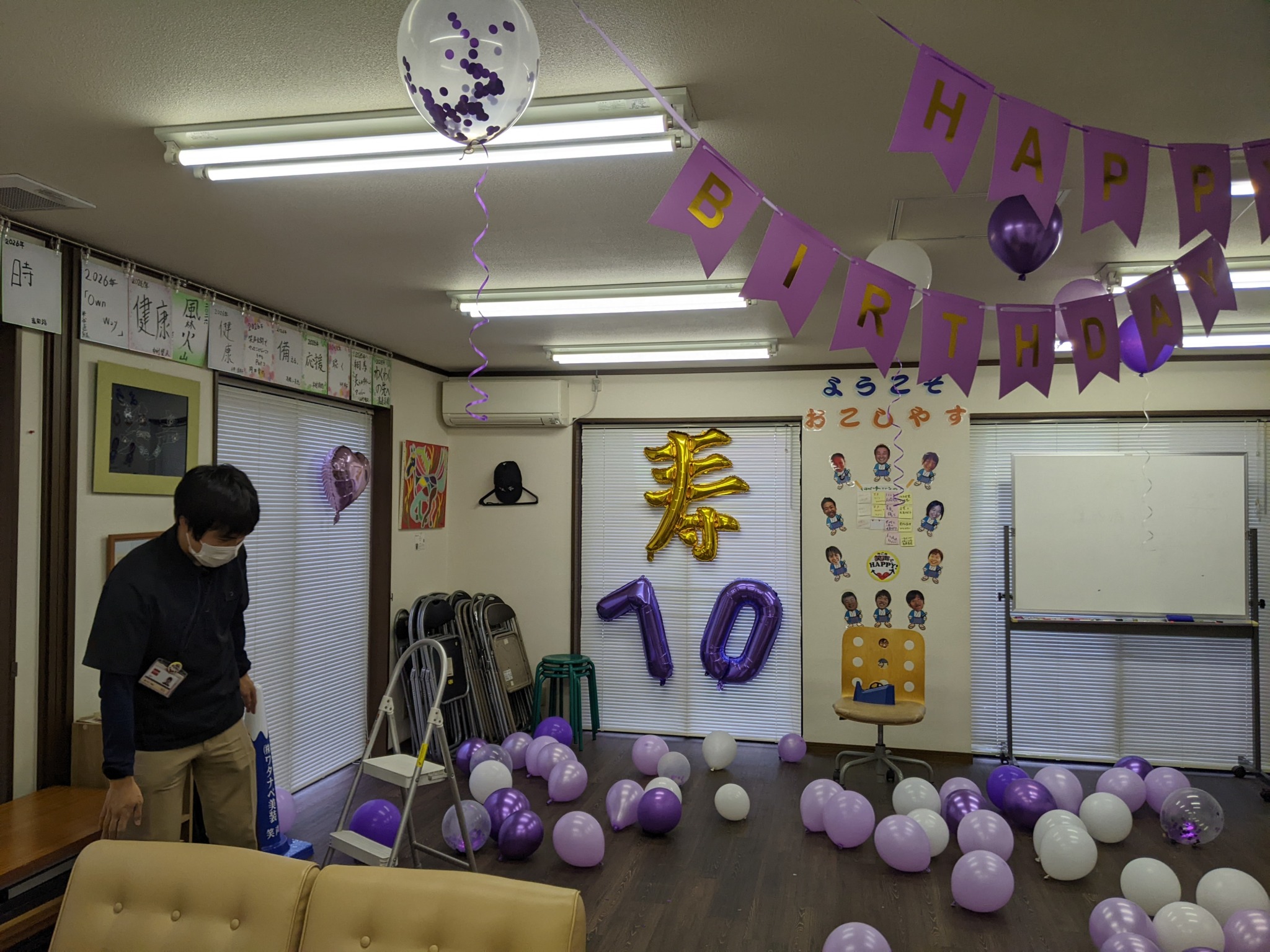 1月末から皆で案を出し合い、古希なので70個の風船を膨らまして