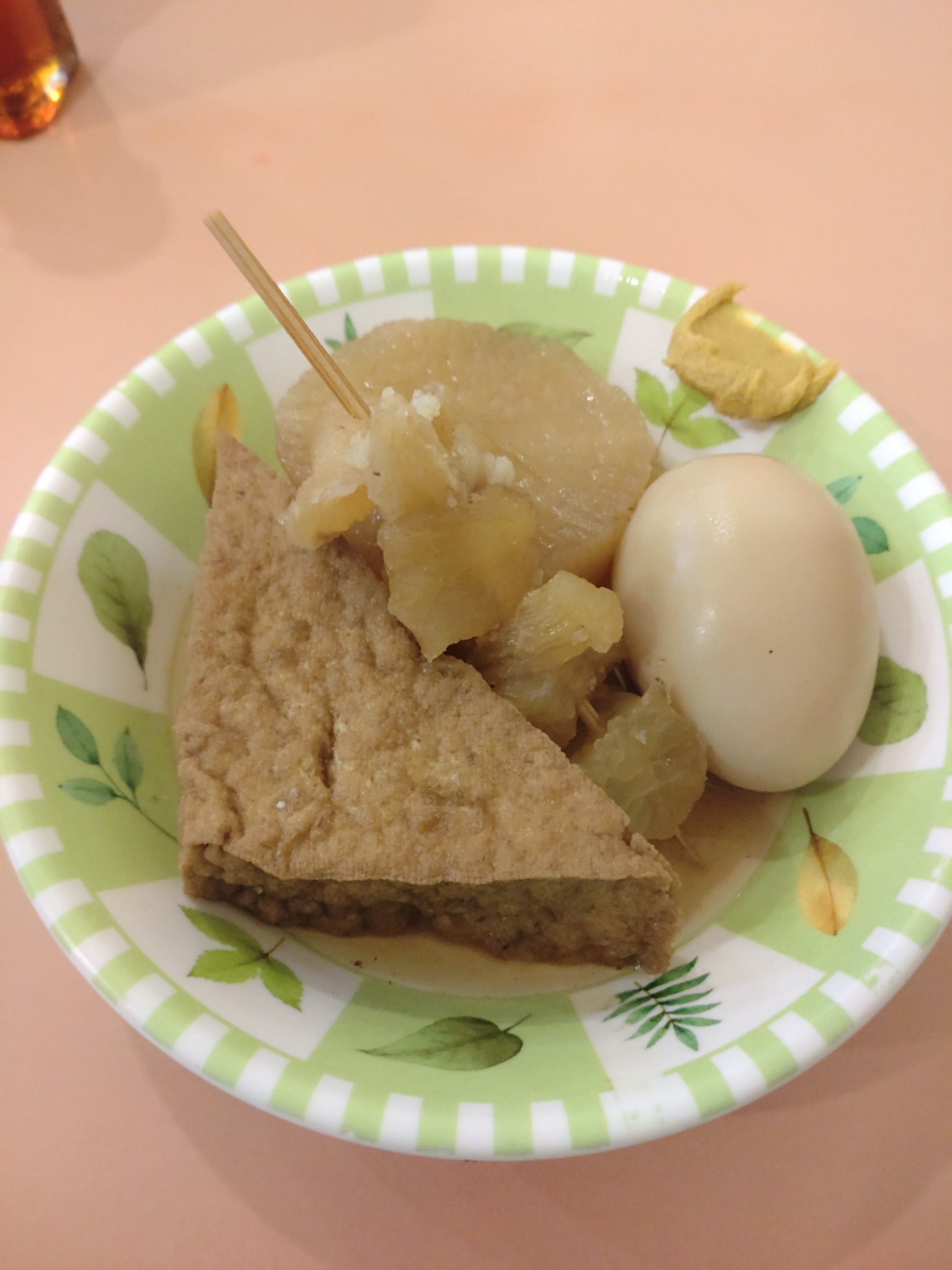 今回は、大根、厚揚げ、玉子、牛すじを注文。1本100円となっています。この日は寒かった事もあり、少し甘めのだしが染みたおでんは心と体を温めてくれました。