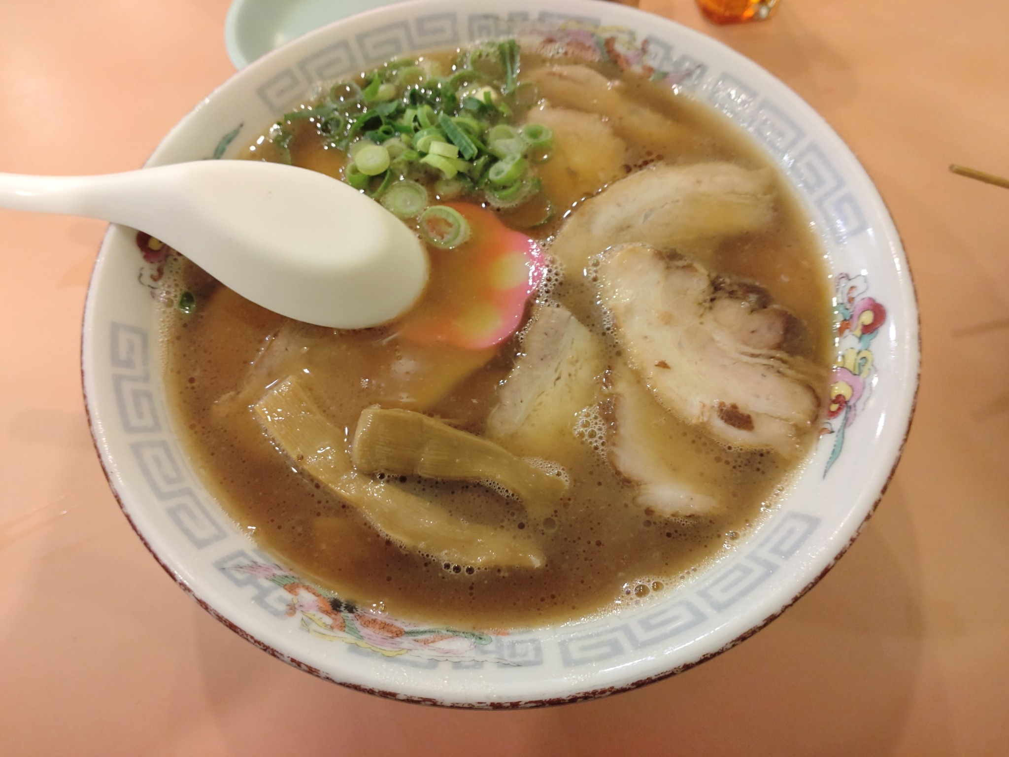 ラーメンのジャンルはいわゆる「車庫前系」で、醤油豚骨ラーメンになります。