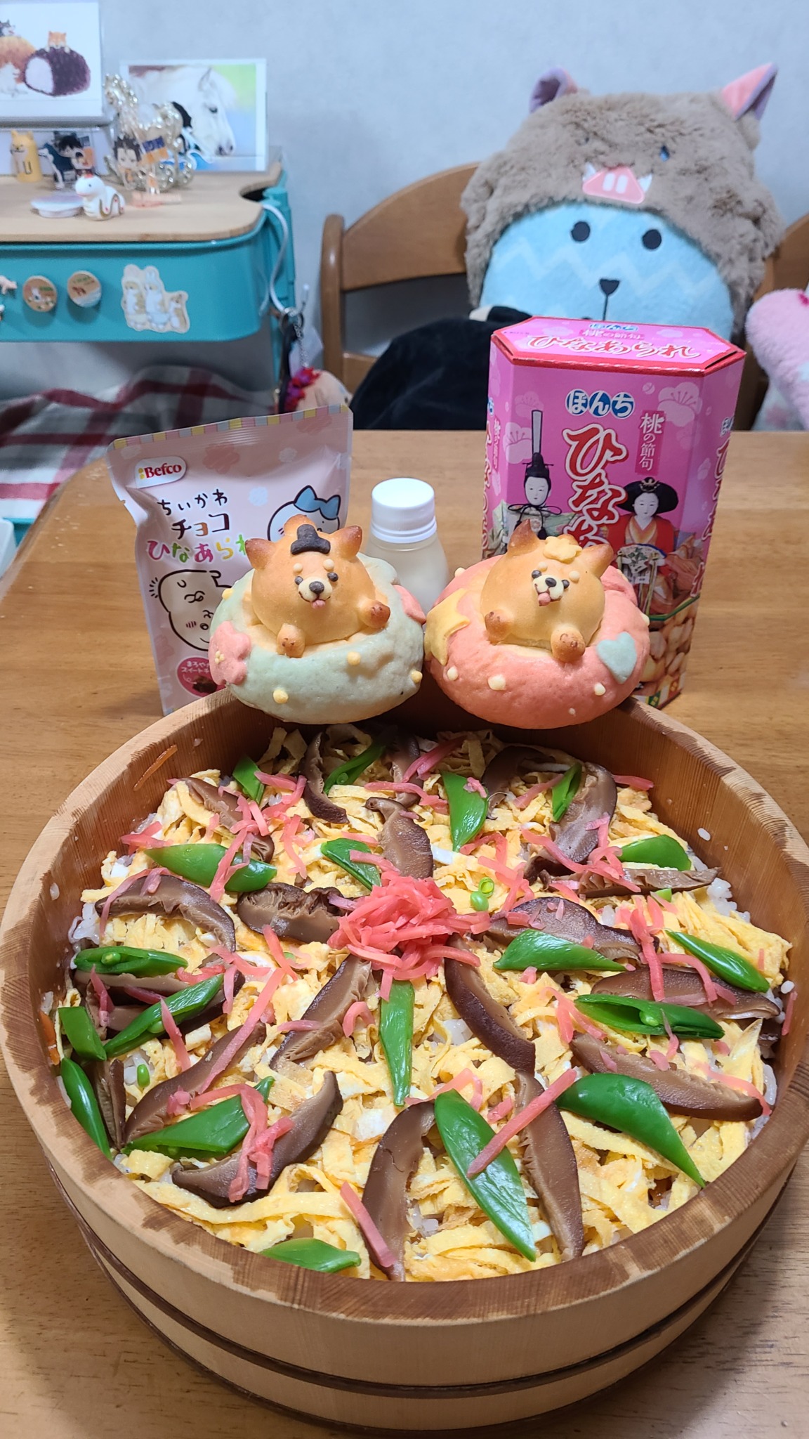 ばあちゃん特製ちらし寿司と、もちりさんの可愛らしいひな祭りパンです。